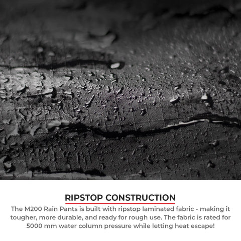 The M200 Rain Pants is built with ripstop laminated fabric—making it tougher, more durable, and ready for rough use. The fabric is rated for 5000 mm water column pressure while letting heat escape!