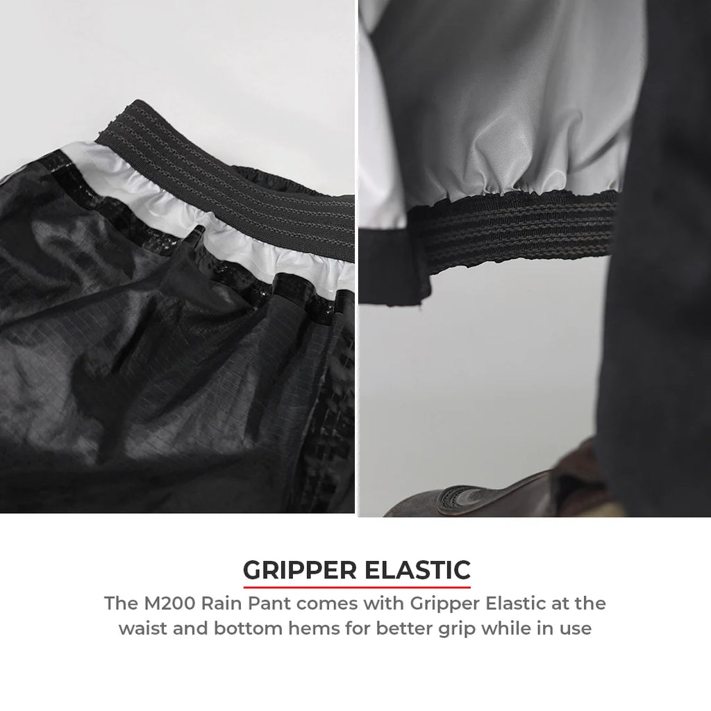The M200 Rain Pant comes with Gripper Elastic at the waist and bottom hems for better grip while in use.