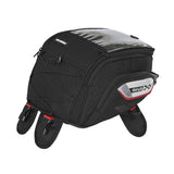 One strap at the front that goes around the T-stem bracket with dual buckle to stop the bag from moving back. The same can be used for re-fueling