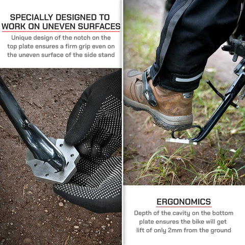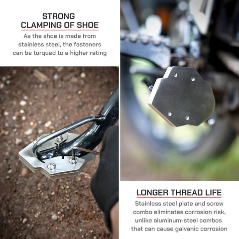 A sidestand shoe improves stability, especially when parking on softer surfaces where your bike would otherwise easily lean over. Our sidestand shoes are specifically designed and made with precision for different types of motorcycles using high quality materials and components. ViaTerra sidestand shoes provide a much larger footprint for your motorcycle, improving stability when parked on uneven or soft surfaces. It makes the side-stand base wider to spread the weight and prevent the bike from sinking into the ground. This is essential for riders exploring new trails or touring where they might encounter different types of surfaces.